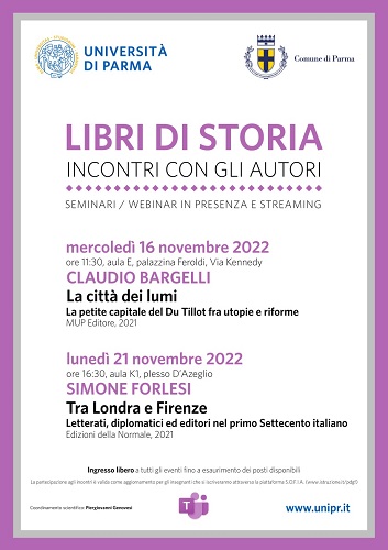 Il secondo appuntamento della rassegna è in programma per lunedì 21 novembre (ore 16.30, Aula K1 del Plesso D’Azeglio-Kennedy) e avrà come protagonista il volume Tra Londra e Firenze. Letterati, diplomatici ed editori nel primo Settecento italiano (Edizioni della Normale, 2021) di Simone Forlesi.