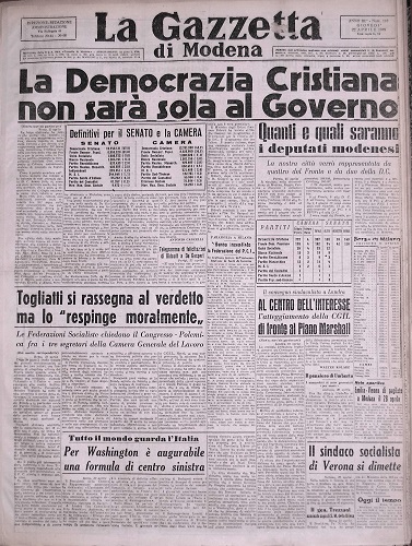 MODENA – I due fatti salienti del 1948 per la Repubblica italiana furono l’entrata in vigore della Costituzione l’1 gennaio e le elezioni per il primo Parlamento repubblicano, il 18 e 19 aprile. Le elezioni segnarono una svolta nella politica interna italiana e nella collocazione internazionale del Paese. E proprio a quel momento cruciale per la nuova Repubblica e la democrazia, al Palazzo dei Musei in largo Sant’Agostino dal 14 settembre, la biblioteca civica d’arte Poletti e l’Archivio storico del Comune dedicano la mostra “1948 L’Italia al bivio. Verità e menzogne di una Repubblica inquieta” insieme con una serie di eventi collaterali con gli attori di Ert.
