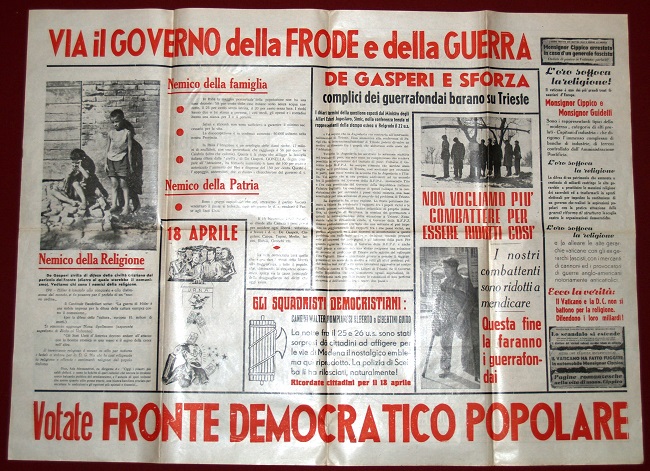 La mostra documenta e rievoca il clima di fervore civile e di acceso scontro politico che accompagna i primi passi della democrazia italiana, attraverso l’esposizione di una selezione di materiali documentari e iconografici (manifesti, volantini, giornali murali, fumetti, cartoline, quotidiani, riviste e documenti d’archivio) accostati per sottolineare il pluralismo delle verità discordanti e contrapposte sui temi caldi della competizione elettorale: la libertà, la pace, la ricostruzione, il rilancio economico, il lavoro, le tasse, il futuro dei giovani e delle famiglie, la guerra fredda agli esordi.