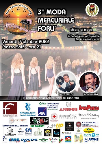 FORLÌ – Venerdì 7 ottobre, alle ore 21.00, è in programma in piazza Saffi la “Sfilata di Moda Mercuriale“. L’evento, che si sarebbe dovuto svolgere in settembre ma è stato rinviato causa maltempo, unisce in una serata speciale la bellezza e la creatività della moda a valori civici come l’associazionismo, la voglia di stare insieme e la solidarietà in favore dell’ospedale Pierantoni-Morgagni. Saranno oltre 40 i modelli e le modelle che sfileranno sul red carpet mettendo in mostra creazioni di moda affascinanti e sorprendenti. L’organizzazione è curata da “Sport Cultura e Futuro” che, con il patrocinio del Comune di Forlì, organizza la sfilata coinvolgendo i negozi del centro storico.