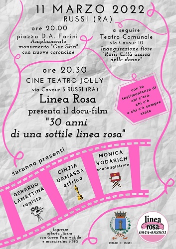 Iniziative in occasione della festa della donna: venerdì 11 marzo, in piazza Farini a Russi ampliamento monumento con nuove coroncine, di fronte al Teatro Comunale inaugurazione della mattonella “Russi Città amica delle donne”e alle 20.30, presso il Cinema Jolly, proiezione del docufilm per i trent’anni di Linea Rosa