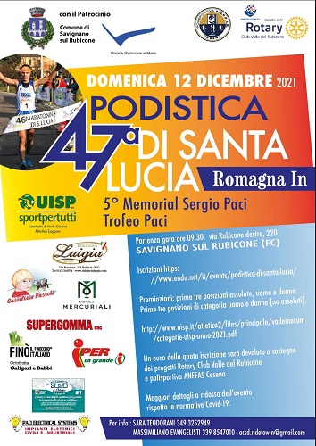 La 47^ edizione della Podistica di Santa Lucia, gara di 13,650 chilometri lungo le sponde del Rubicone, prenderà il via domenica 12 dicembre 2021, con partenza alle 9.30 da via Rubicone Destra, 220 a Savignano sul Rubicone (Fc).
