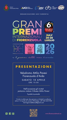 FIORENZUOLA D’ARDA (PC) – Torna dal 20 al 25 luglio l’appuntamento con i Gran Premi Internazionali di Fiorenzuola – 6 Giorni delle Rose Bianche al Velodromo Attilio Pavesi. La manifestazione sarà presentata ufficialmente sabato 18 aprile alle ore 10 proprio al Velodromo di Fiorenzuola d’Arda. Nell’occasione, gli invitati potranno anche visitare il Museo Attilio Pavesi. Un momento di lancio per uno degli eventi più attesi del ciclismo su pista internazionale, che nel prossimo mese di luglio arriverà all’edizione numero 29.