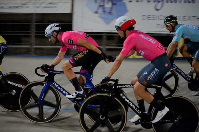 FIORENZUOLA D’ARDA (PC) – Primo avvicendamento in testa alla classifica generale della 6 Giorni delle Rose di Fiorenzuola: al Velodromo “Attilio Pavesi”, dopo la seconda giornata di gare, i nuovi leader della classifica generale sono i bergamaschi Davide Plebani e Stefano Moro, in maglia Rosti (peraltro azienda bergamasca anch’essa), che hanno conquistato l’americana finale, superando così Lamon e Scartezzini (Acef). Il momento decisivo è arrivato a 31 giri dal termine, con la tornata guadagnata (la prima di tutta la Sei Giorni) da Moro e Plebani insieme a Matteo Donegà ed Emanuele Amadio (Salumificio La Rocca).
