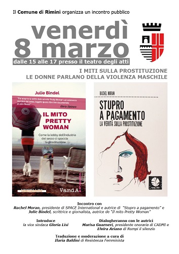 Incontro pubblico sul tema della prostituzione e della violenza maschile, con la partecipazione della scrittrice Rachel Moran, fondatrice di Space International e autrice di “Stupro a pagamento” e Julie Bindel, scrittrice e giornalista, autrice de “il mito Pretty Woman”.