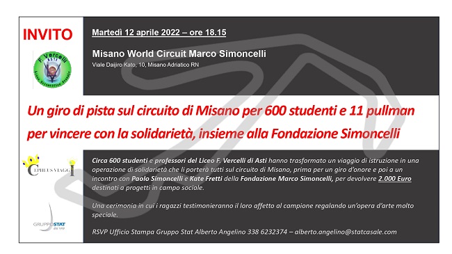 MISANO ADRIATICO (RN) – Martedì 12 aprile sul circuito di Misano, 600 ragazzi di Asti in gita scolastica (tutto un intero Liceo) percorreranno il circuito in un giro d’onore a bordo di 11 pullman e poi devolveranno 2000 Euro alla Fondazione Simoncelli.