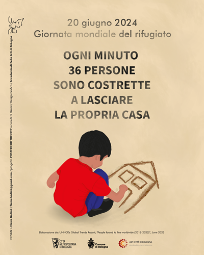 Come l’anno scorso, l’immagine ufficiale della rassegna è stata realizzata nell’ambito del progetto POSTER FOR THE CITY, realizzato in collaborazione con l’Accademia di Belle Arti di Bologna. Tra le diverse immagini proposte dalla classe del corso di Design Grafico del prof. Danilo Danisi, è stata selezionata quella di Flavia Badiali, che rimanda al primo dei tanti drammi che vivono le persone rifugiate: lasciare la propria casa.