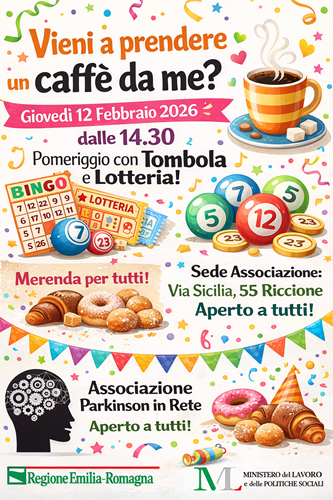 RICCIONE (RN) – Un invito semplice, come quello che si rivolge a un amico, per festeggiare il Carnevale all’insegna della convivialità. L’associazione Parkinson in rete apre le porte della propria sede con l’iniziativa “Vieni a prendere un caffè da me?”, un appuntamento pensato per stare insieme, divertirsi e condividere un momento di gioia e spensieratezza.