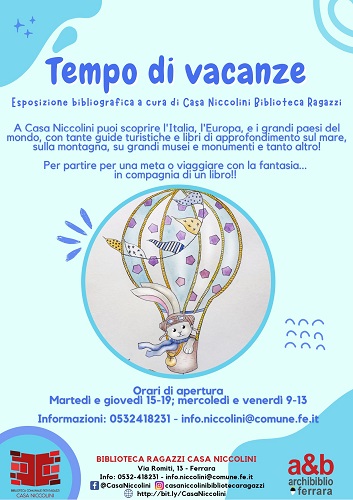 FERRARA – A Casa Niccolini le vacanze estive si trascorrono anche in compagnia di un buon libro. Fino al 26 agosto prossimo la biblioteca comunale di via Romiti 13 a Ferrara, attende infatti bimbi e ragazzi con tante proposte di letture estive, tutte raccolte nell’esposizione bibliografica ‘Tempo di vacanze’. La mostra è visitabile, con ingresso libero e gratuito, negli orari di apertura al pubblico (martedì e giovedì dalle 15 alle 19; mercoledì e venerdì dalle 9 alle 13). A disposizione tante guide turistiche per scoprire l’Italia, l’Europa e i grandi paesi del mondo, e libri di approfondimento sul mare, sulla montagna, su grandi musei e monumenti, e tanto altro.