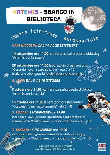 L’iniziativa rientra nel ciclo di eventi “Artemis – sbarco in biblioteca“, che comprende due appuntamenti sempre a casa Niccolini: il 14 settembre alle 11 con una conferenza in occasione dell’inaugurazione della mostra e il 28 settembre alle 10.30 con un laboratorio per bambini. Gli eventi culturali del progetto continueranno poi, fra ottobre e novembre prossimi, alla biblioteca A. Luppi, alla biblioteca Bassani e alla biblioteca G. Rodari (in allegato il PROGRAMMA completo).