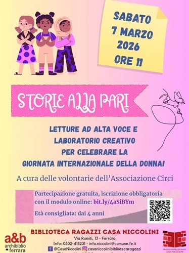 FERRARA – Storie di parità, grandi personaggi femminili e bambine coraggiose, per celebrare insieme la Giornata internazionale dei diritti della Donna. L’appuntamento, per bambine e bambini dai 4 anni, è per sabato 7 marzo 2026 alle 11:00 alla biblioteca comunale Casa Niccolini (via Romiti 13, Ferrara). Le lettrici volontarie dell’Associazione Circi proporranno ai piccoli partecipanti tante letture coinvolgenti e, a seguire, un laboratorio creativo a tema.