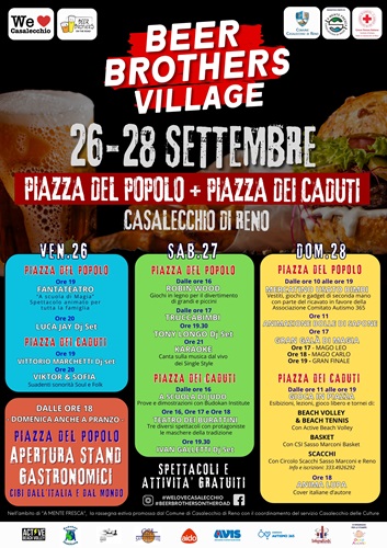 CASALECCHIO DI RENO (BO) – Conto alla rovescia cominciato per la prima edizione del BEER BROTHERS VILLAGE, format da anni consolidato sul territorio bolognese che DA VENERDÌ 26 A DOMENICA 28 SETTEMBRE riempirà di sapori e iniziative per tutta la famiglia Piazza del Popolo e Piazza dei Caduti, con apertura ANCHE DOMENICA A PRANZO.