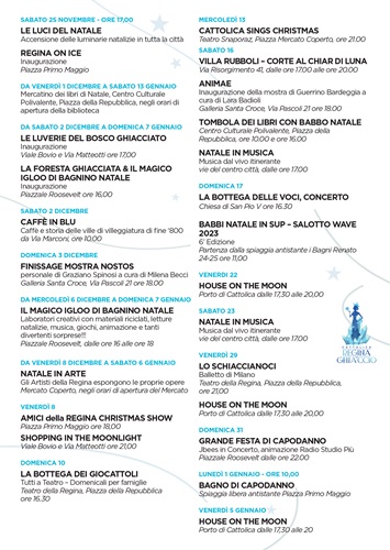 CATTOLICA (RN) – A Cattolica, il Natale entra nel vivo dell’incantesimo della Regina di ghiaccio sabato 2 dicembre, alle ore 16, in piazza Roosevelt, con l’inaugurazione della novità assoluta e originale del magico Igloo di Bagnino Natale, che ha anche attirato l’attenzione dei media nazionali, un progetto proposto da “Le spiagge di Cattolica”, e realizzato insieme con l’Amministrazione comunale che darà il “la” alle feste con i saluti della Sindaca Franca Foronchi e del vice sindaco Alessandro Belluzzi. L’Igloo è un progetto che educa alla cultura del riuso, regalando ai bambini i giochi dimenticati sulle spiagge d’estate, dopo averli di nuovo incartati, donando loro una seconda vita e nuova gioia ai più piccoli. Ma sempre nell’ottica della sostenibilità, ci saranno tanti altri laboratori nella trasparente struttura geodetica di 27 metri quadrati davanti a Palazzo Mancini, oltre alle bellissime letture a cura del Centro Culturale Polivalente. Taglio del nastro anche della Ruota panoramica, sempre in piazza Roosevelt e a seguire, quello delle Luverie del Bosco ghiacciato, le casette gourmet in viale Bovio e via Matteotti. Entra nel vivo anche la Regina on Ice, la pista di pattinaggio sul ghiaccio di piazza Primo Maggio, già diventata meta di giovani e famiglie per divertenti pattinate al coperto.