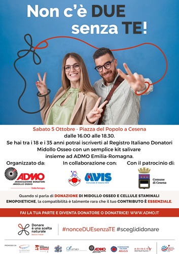 Il Comune di Cesena ha deciso di supportare la campagna, patrocinando l’iniziativa, che si svolgerà sabato 5 ottobre in piazza del Popolo: in collaborazione con AVIS Cesena ODV e l’Associazione di Clownterapia VIP (Viviamo in Positivo Onlus), ADMO Emilia-Romagna sarà presente dalle ore 16.00 alle ore 18.30 con la propria clinica mobile e darà la possibilità a tutti coloro che lo desiderano e sono in possesso dei requisiti la possibilità di diventare donatori di vita, iscrivendosi nel Registro Italiano Donatori Midollo Osseo attraverso un semplice prelievo salivare. L’evento è gratuito e aperto a tutta la cittadinanza.