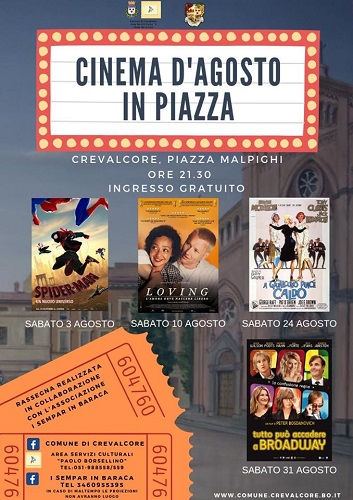 CREVALCORE (BO) – In occasione dei week-end di chiusura del centro storico, il Comune di Crevalcore promuove “Cinema d’agosto in piazza”, quattro appuntamenti con il grande schermo in piazza Malpighi, a ingresso libero, dalle ore 21.30.