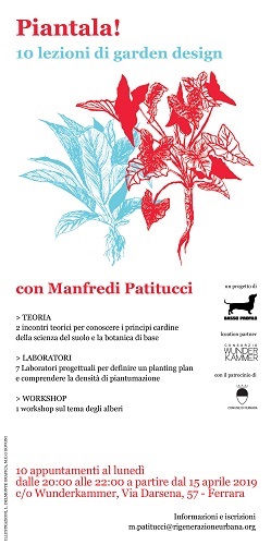 Piantala! 10 lezioni di garden design, è in partenza dal 15 aprile a Ferrara (Palazzo Savonuzzi, via Darsena 57 Ferrara). Il progetto, ideato dall’associazione di promozione sociale Basso Profilo, con il patrocinio del Comune di Ferrara e a cura di Manfredi Patitucci è pensato per chi voglia conoscere il ruolo fondamentale svolto dai giardini, anche i più piccoli, nei confronti della qualità dell’ecologia urbana, e per chi voglia progettarne uno. Per informazioni e iscrizioni: m.patitucci@rigenerazioneurbana.org. Manfredi Patitucci si è formato a Londra, alla Birkbeck University, dove ha appreso la storia, la scienza e la cultura del giardino. Ha studiato allo IUAV-Istituto Universitario di Architettura di Venezia e allo IUG-Institut d’Urbanisme de Grenoble, in Francia. Sua è l’ideazione del progetto del Bosco Claudio Abbado a Ferrara. È inoltre presidente dell’associazione Basso Profilo.
