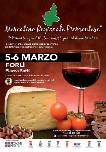 FORLÌ – Il “Mercatino Regionale Piemontese”, fiera itinerante delle eccellenze enogastronomiche piemontesi, sarà di scena sabato 5 e domenica 6 marzo dalle 9.30 alle 19.30 a Forlì, in Piazza Aurelio Saffi.