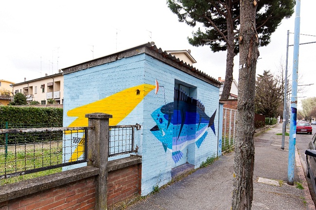 La vicinanza allo Zoo Acquario ha reso immediata la scelta del tema da rappresentare. Lo zoo Acquario è uno dei luoghi simbolo della città e tutti i bambini imolesi almeno una volta nella loro vita hanno avuto l’occasione di visitarlo. Sia il fronte strada che quello interno all’acquario sono il risultato di un intervento grafico a cura di Urto. L’artista ha voluto realizzare due pesci che rappresentassero la fauna un po’ reale e un po’ fantastica, filtrata dall’immaginario dei bambini.
