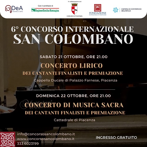 Il Concorso San Colombano, organizzato dall’associazione DeA Donne e Arte in collaborazione con il comune di Piacenza e con il contributo della regione Emilia Romagna, della Fondazione di Piacenza e Vigevano e della Camera di commercio dell’Emilia, si articolerà in 3 sezioni: repertorio lirico, musica sacra e, on line, sezione compositori (di un’aria sacra).