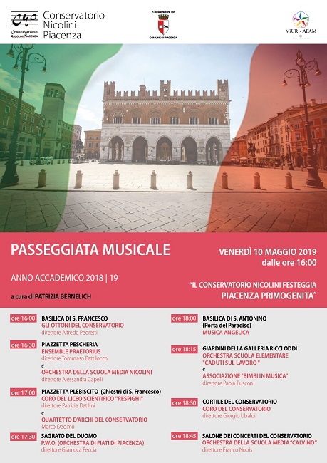 Alle 17.30, sul sagrato del Duomo, P.W.O. (Orchestra di fiati di Piacenza), diretta da Gianluca Feccia; alle 18, presso la Basilica di Sant’Antonino (Porta del Paradiso) “musica angelica” e, alle 18.15, nei giardini della Galleria Ricci Oddi, l’Orchestra della scuola elementare “Caduti sul lavoro” e gli allievi dell’associazione “Bimbi in musica” con la direzione della prof.ssa Paola Busconi. Gran finale dalle ore 18.30 presso la sede del Nicolini in via Santa Franca 35: nel cortile, concerto del Coro del Conservatorio diretto dal Maestro Giorgio Ubaldi; alle 18.45, nel Salone, Orchestra della scuola media Calvino diretta dal prof.Franco Nobis.
