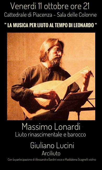 PIACENZA – Venerdì 11 ottobre un suggestivo concerto omaggerà “la musica al tempo di Leonardo” con Massimo Lonardi (Liuto rinascimentale e barocco) e Giuliano Lucini (arciliuto) e con la partecipazione di Alessandra Gardini (voce) e Maddalena Scagnelli (violino).