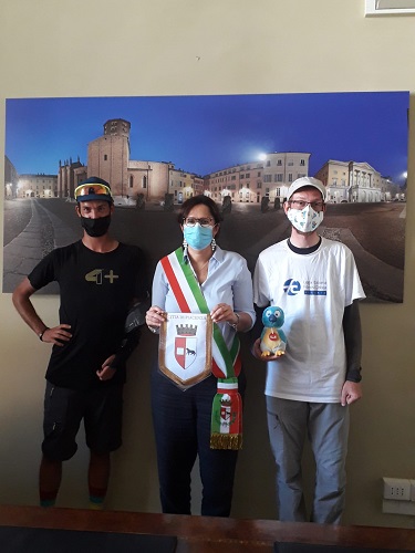 A Daniele è stato consegnato lo stemma della città, accogliendo insieme a lui anche Massimo Pedersoli, pellegrino che, a sostegno della Lega Italiana Fibrosi Cistica, sta percorrendo a piedi il tragitto da Calais a Santa Maria di Leuca. “Ci siamo incontrati ieri lungo il cammino – spiegano – e abbiamo deciso di condividerne un tratto, scoprendo di avere molte cose in comune”. Ad esempio, Massimo – 35 anni, genovese – ha camminato in passato nel nome dei bambini di Chernobyl, che tante volte la famiglia di Daniele ha ospitato in Italia durante il periodo estivo.