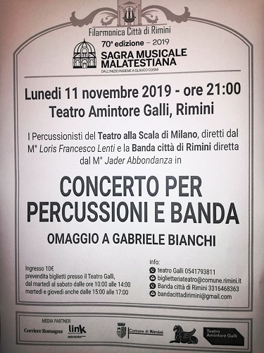 RIMINI – Lunedi 11 novembre 2019 alle ore 21 presso il Teatro A. Galli di Rimini la Banda città di Rimini diretta dal m° Jader Abbondanza e l’Ensemble delle Percussioni del teatro alla Scala di Milano, dirette da Loris Francesco Lenti si esibiranno in un’originale e, per molti versi, irripetibile CONCERTO PER BANDA E PERCUSSIONI, Omaggio a Gabriele Bianchi.