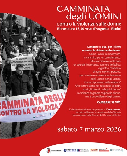 La “Camminata degli uomini contro la violenza sulle donne” è promossa nell’ambito delle iniziative del Comune di Rimini per la Giornata Internazionale dei Diritti della Donna “L’otto sempre”, organizzata da Associazione DireUomo, in collaborazione con Associazione Cambiamenti e Movimento Centrale Danza&Teatro.