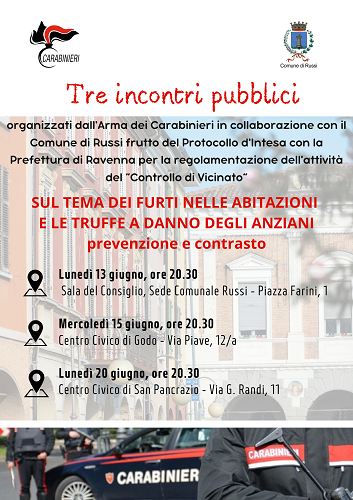 RUSSI (RA) – Come frutto della collaborazione fra l’Arma dei Carabinieri e il Comune di Russi e in virtù dell’impegno da esso intrapreso dopo la firma del Protocollo d’Intesa con la Prefettura di Ravenna per la regolamentazione dell’attività del “Controllo di Vicinato”, si propongono altri tre appuntamenti in compagnia dei Carabinieri di Russi, per parlare di furti nelle abitazioni e truffe a danno degli anziani, che avranno luogo in altrettante zone del Comune.