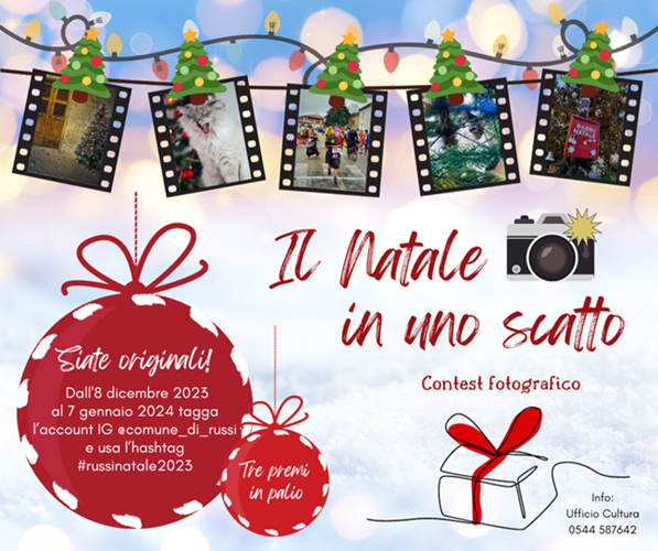 RUSSI (RA) – Al via l’8 dicembre il contest natalizio “Il Natale in uno scatto – edizione 2023/2024”, il contest fotografico indetto dal Comune di Russi per selezionare le migliori fotografie realizzate durante il periodo natalizio a Russi e frazioni.