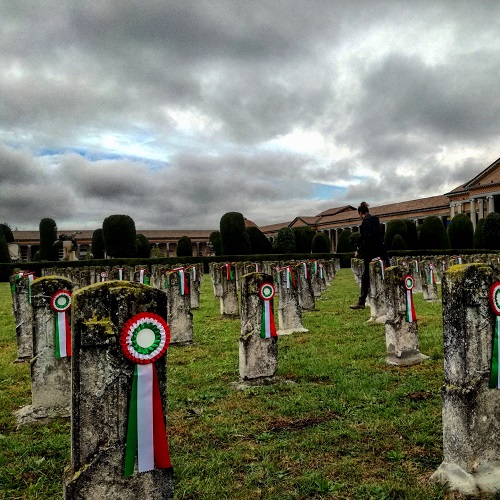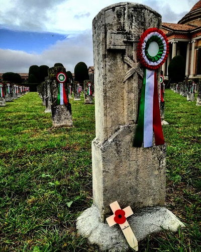 MODENA – Una coccarda su ciascuno dei 967 cippi del Sacrario dei caduti della Prima Guerra Mondiale del Cimitero di San Cataldo.