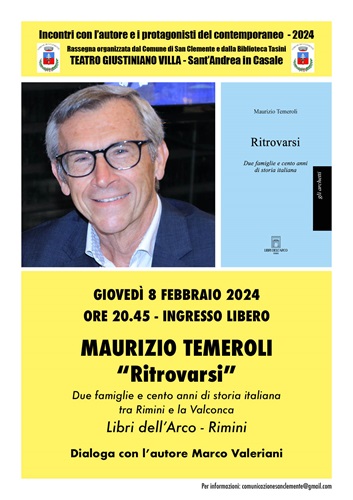 SAN CLEMENTE (RN) – Incontri con l’Autore e i Protagonisti del Contemporaneo, la rassegna organizzata dal Comune di San Clemente e dalla Biblioteca “Giuseppe Tasini”, ospita, giovedì 8 febbraio 2024 – Teatro Giustiniano Villa, inizio ore 20.45, ingresso libero – Maurizio Temeroli con il romanzo “Ritrovarsi” – Due famiglie e cento anni di storia italiana tra Rimini e la Valconca.