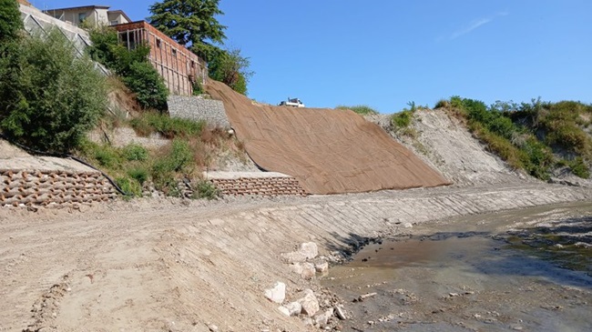 Il versante in erosione è stato protetto con una rete metallica accorpata a biostuoia e ancorata al substrato roccioso con chiodature.