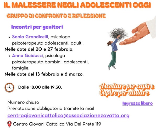 Gli appuntamenti si svolgeranno nella sede del Centro Giovani, in via del Prete 119, dalle 18 alle 19.30. Le date in programma sono: 13 febbraio e 6 marzo con Anna Guiducci, psicologa psicoterapeuta, con esperienza nell’ambito dell’età evolutiva e del sostegno alle famiglie, e il 20 e 27 febbraio con Sonia Grandicelli, psicologa psicoterapeuta adolescenti, adulti.