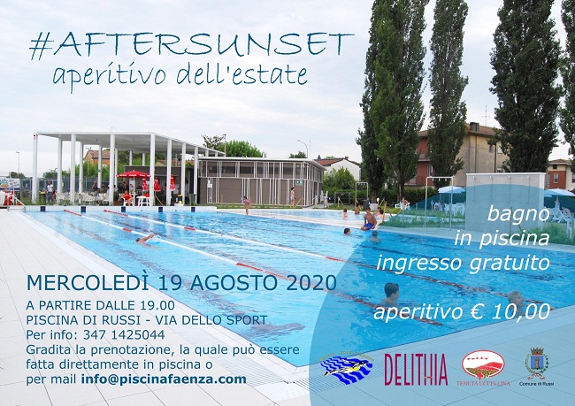 RUSSI (RA) – Quest’anno l’aperitivo “#Aftersunset ”, organizzato da Delithia, Tenuta Uccellina e Nuova CO.G.I. Sport, con il patrocinio del Comune di Russi, si terrà mercoledì 19 agosto 2020, a partire dalle ore 19, presso l’area di pertinenza della piscina Comunale, con accesso da via dello Sport.