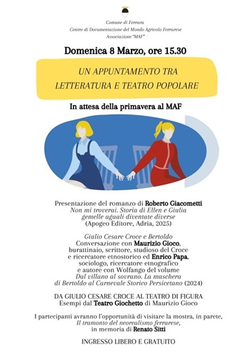 La seconda parte dell’evento sarà dedicata a Giulio Cesare Croce e al suo Bertoldo. Interverranno Maurizio Gioco, burattinaio, scrittore e ricercatore etnostorico veronese, ed Enrico Papa, sociologo e ricercatore etnografico bolognese, coautore con Wolfango di un volume sulla maschera di Bertoldo. I relatori analizzeranno l’attualità di questo autore cinquecentesco e seicentesco, le cui opere hanno lasciato un’impronta nella cultura popolare.