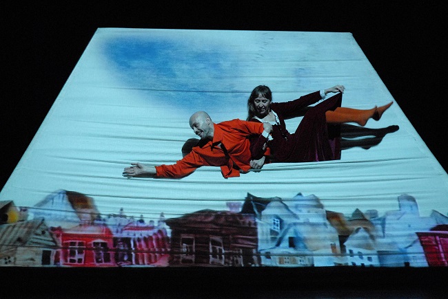 L’incontro tra i corpi dei due attori e le immagini pittoriche avviene all’interno di un dispositivo scenografico che consente la realizzazione di figure ibride tra il reale e il fantastico.