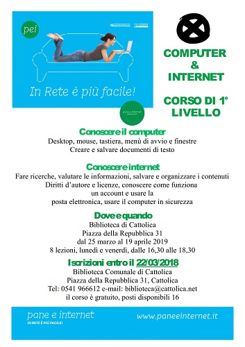 CATTOLICA (RN) – Anche la Biblioteca del Comune di Cattolica ha aderito al progetto Pane e Internet, promosso dalla Regione nell’ambito dell’Agenda Digitale dell’Emilia-Romagna, con la collaborazione degli enti locali, delle biblioteche, delle scuole e delle associazioni del terzo settore. La sua finalità è offrire opportunità di alfabetizzazione informatica e apprendimento continuo sull’uso delle tecnologie digitali e dell’accesso a Internet ai cittadini a rischio di esclusione digitale. Si tratta principalmente di anziani, donne (in particolare casalinghe), soggetti fragili, chi è in cerca di occupazione e/o ha un basso livello di scolarità e i segmenti più deboli della popolazione immigrata.
