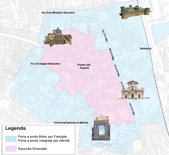 - per le quasi 400 utenze della zona azzurra più esterna (compresa fra la stazione a est, via Don Giovanni Minzoni a nord, via D’Azeglio a ovest e la Circonvallazione al Molino a sud) la raccolta dei rifiuti sarà mista per le famiglie (che prevede la raccolta a domicilio di indifferenziato e organico in giorni e orari prestabiliti e stradale per tutti gli altri rifiuti), e integrale (per tutti i tipi di materiali: organico, carta/cartone, plastica, vetro e indifferenziato) per le attività. Dai primi di novembre partirà la rimozione graduale dei cassonetti stradali dell’organico e dell’indifferenziato.