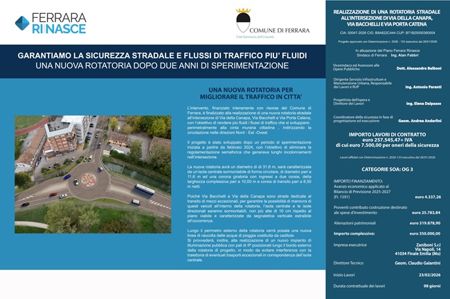FERRARA – Sicurezza stradale e fluidità del traffico: è con queste finalità che il Comune di Ferrara si appresta a realizzare la nuova rotatoria all’intersezione tra le vie Bacchelli, Canapa e Porta Catena.