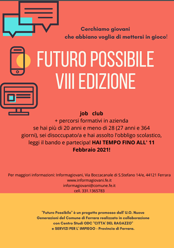 FERRARA – Lunedì 11 gennaio 2021 verrà pubblicato il nuovo bando per l’adesione al progetto “Futuro Possibile”. Il progetto, giunto quest’anno alla VIII edizione, è promosso dal U.O. NUOVE GENERAZIONI del Comune di Ferrara in collaborazione con i Servizi per l’Impiego ed il Centro Studi Opera don Calabria “Città del ragazzo” di Ferrara e finanziato dal Fondo Sociale Locale del Piano del Benessere Sociale e Sanitario del Distretto Centro Nord.