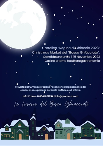 CATTOLICA (RN) – Dal prossimo 2 dicembre 2023 e fino al 7 gennaio 2024, la città di Cattolica tornerà ad essere immersa nell’atmosfera delle festività natalizie. Per tutto il periodo una serie di iniziative, di diverse tipologie, la trasformerà in un salotto delle feste capace di attrarre ed accogliere persone di ogni età. Lungo viale Bovio, via Matteotti (tratto via Corridoni – Bovio), verranno allestite le casine dei Mercatini del “Bosco Ghiacciato” che anche quest’anno saranno esclusivamente dedicate ai prodotti tipici agroalimentari, dolciumi, dolci tradizionali natalizi ed enogastronomia.