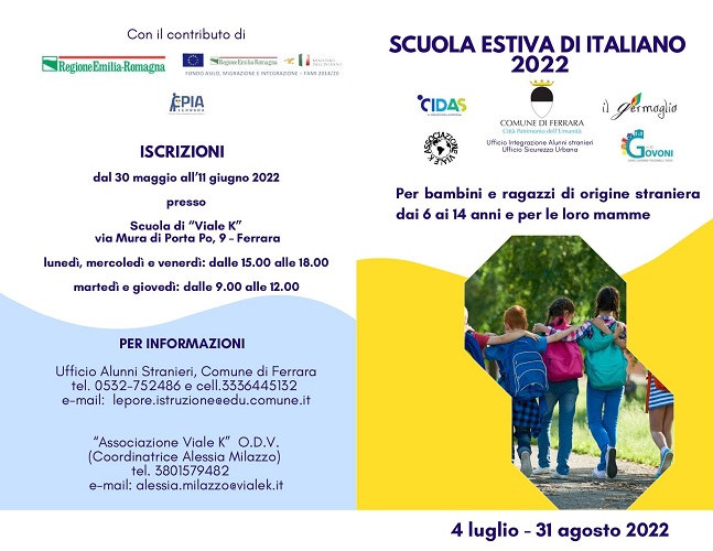Il progetto della Scuola estiva di Italiano, promosso e finanziato dal Comune di Ferrara (Ufficio alunni stranieri e Ufficio sicurezza urbana), è gestito da Associazione “Viale K” Odv, Coop. Cidas e Coop Il Gemoglio. Al progetto contribuiscono oltre all’Istituto “C. Govoni”, all’Istituto Comprensivo “A.Manzi”, al Centro per l’Istruzione degli Adulti (Cpia) di Ferrara, anche le associazioni Anolf e Auser.