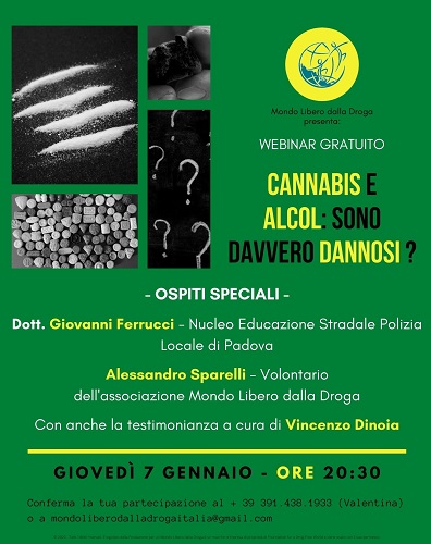EMILIA ROMAGNA – Giovedì 7 Gennaio alle ore 20.30 i volontari dell’associazione di volontariato Mondo Libero dalla Droga saranno online per parlare di prevenzione alle dipendenze. Per questo stanno organizzando un webinar informativo gratuito dove si discuterà sull’abuso di alcol e cannabis.