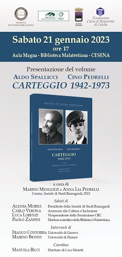CESENA – Sabato 21 gennaio, alle ore 17, nell’Aula Magna della Biblioteca Malatestiana si terrà la presentazione del libro “Aldo Spallicci – Cino Pedrelli. Carteggio 1942-1973” a cura di Marino Mengozzi e Anna Lia Pedrelli (Cesena, Società Studi Romagnoli, 2022), e pubblicato grazie al sostegno del Comune di Cesena e della Fondazione Cassa di Risparmio di Cesena. Il pomeriggio sarà introdotto dai saluti della Presidente della Società Studi Romagnoli Alessia Morigi, dell’Assessore alla Cultura e all’Inclusione Carlo Verona, del Vicepresidente della Fondazione Crc Luca Lorenzi e di Paolo Zanfini, Direttore Scientifico della Biblioteca Malatestiana.