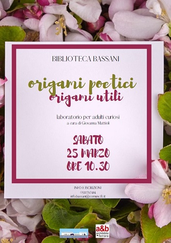 FERRARA – Un sabato mattina dedicato alla creazione di origami per tutte le occasioni. L’appuntamento è per il prossimo 25 marzo alle 10.30 alla biblioteca comunale Bassani (via Grosoli 42, zona Barco, Ferrara) con un laboratorio per adulti in compagnia di Giovanna Mattioli.