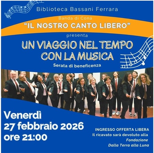 FERRARA – Sarà il coro ‘Il Nostro Canto Libero’ il protagonista della serata di venerdì 27 febbraio 2026 alle 21:00 alla biblioteca comunale Bassani (via G. Grosoli 42, Barco – Ferrara) con ‘Un viaggio nel tempo con la musica’.