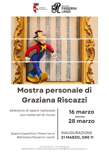 PIACENZA – Dal 16 al 28 marzo presso lo Spazio mostre al piano terra della Biblioteca Passerini-Landi sarà esposta una selezione di opere realizzate con materiali di riciclo da Graziana Riscazzi.