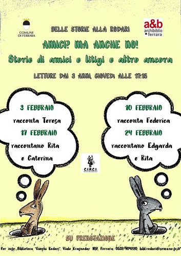 FERRARA – Nuove storie e racconti di amicizie attendono i bambini dai tre anni giovedì 24 febbraio 2022 alle 17.15 alla biblioteca comunale Rodari di Ferrara (viale Krasnodar 102). Il nuovo appuntamento con le ‘Belle storie’ del giovedì pomeriggio sarà curato da Edgarda e Rita dell’associazione Circi Ferrara-Cerchio di libri, che proporranno tante belle narrazioni per bambine e bambini.