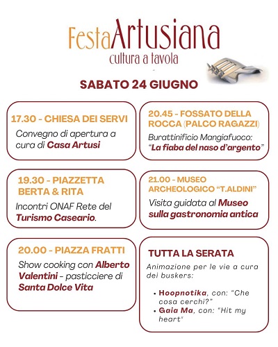 Ogni sera, dal 24 giugno al 2 luglio, nello spazio allestito in piazza Pompilio, i ragazzi dell’Istituto “Pellegrino Artusi”, che vanta una solida tradizione nel formare professionisti dell’impresa ristorativa e alberghiera, si alterneranno all’interno dello stand, affiancati dai propri docenti, nella preparazione di un primo che sarà offerto abbinato ad un vino.